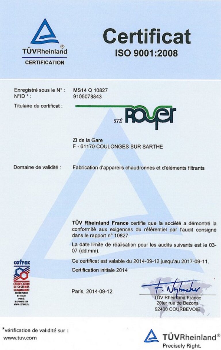 - Certifications ISO 9001-2008 : Fabrications d’appareils chaudronnés et d’éléments filtrants